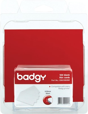 Blank thin cards are part of Badgy100 and Badgy200 printing systems that generate personalized cards in less than a minute. Cards are made of PVC for durable use. With a thickness of 0.50mm (20 mil), (CR-80) credit card-size, white cards may be printed on both sides.