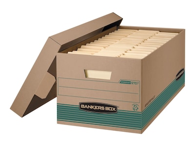 Archive files securely with this 12-pack of Bankers Box Stor/File 100 percent recycled legal-size kraft storage boxes.
