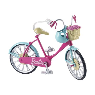 This Barbie bicycle is ready to ride into imagination! A pink body, teal fenders and silvery accents are oh-so-pretty. Real working pedals and wheels make bike riding a breeze. Place Barbie doll (sold separately) on the bike seat where a clip holds her in place. Slide her feet into the pedals and her hands onto the handlebars, then push to see the doll ride! A blue helmet keeps Barbie doll safe. And a basket of pink flowers at the front dresses up her bicycle, too! They can be taken in and out to add to play. Go for a short ride or pedal off into adventure -- this bike is ready to roll! Includes Barbie bicycle with basket and flowers and helmet; doll not included. Colors and decorations may vary.