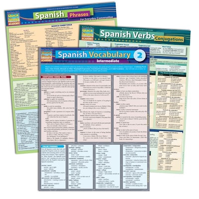 - Set Includes: 1 each of Spanish Phrases, Spanish Verbs - Conjunctions and Spanish Vocabulary 2: Intermediate laminated reference guides