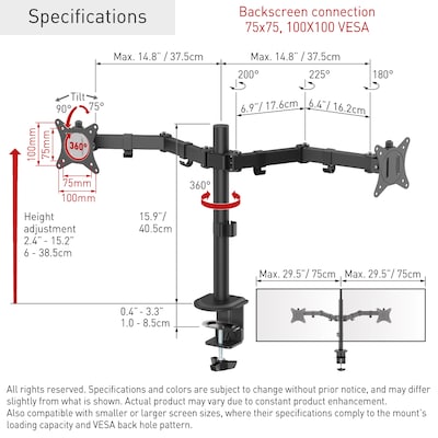 - Maximum height from screen connection center to the desk: 15.2" / 38.5 cm.
