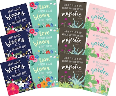 Barker Creek's Petals & Prickles Art Prints Set include twelve 8 x 10" art prints (three each of four prints). These art prints are perfect for the classroom, workplace or home! Frame them or hang them "as is"! The designs feature vibrant colors with beautiful flowers of various size and colors along with cacti and succulents. The navy art print features the quote "Every flower blooms at a different pace" by Suzy Kassem. The chocolate brown art print features the quote "Each of us is like a seed we might grow into something majestic" by Seth Adam Smith. The aqua art print features the quote "Love without reason bloom without season" by Debasish Mridha. The blush pink art print features the quote "We must cultivate our own garden" by Voltaire. Coordinating products available: Search Barker Creek Petals & Prickles.