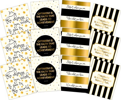 Barker Creek's Creativity, Intelligence & Optimisim Art Prints Set include twelve 8 x 10" art prints (three each of four prints) that feature inspirational sayings! These art prints are perfect for the classroom, workplace or home! Frame them or hang them "as is"! These twelve art prints feature the following quotes: "Creativity is intelligence having fun." ~ Albert Einstein, "Optimism is the faith that leads to achievement." ~ Helen Keller, "Be the change you wish to see in the world." ~ Gandhi, and "Start where you are. Use what you have. Do what you can." ~ Arthur Ashe. Coordinating products available: Search Barker Creek Gold.