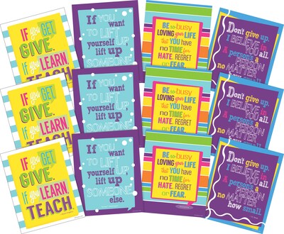 Barker Creek's I Believe in You Art Prints Set include twelve 8 x 10" art prints (three each of four prints) that feature inspirational sayings! These art prints are perfect for the classroom, workplace or home! Frame them or hang them "as is"! These twelve art prints feature the following quotes: "Life is one grand, sweet song, so start the music." ~ Ronald Regan, "Don't give up. I believe in you all. A person's a person no matter how small." ~ Dr. Seuss, "If you want to lift yourself up, lift someone else up" ~ Booker T. Washington, and"If you get, give. If you learn, teach." ~ Maya Angelou. Coordinating products available: Search Barker Creek Happy.