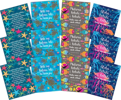 Barker Creek's Kai Ola Art Prints Set includes twelve 8 x 10" art prints (three each of four prints). These art prints are perfect for the classroom, workplace or home! Frame them or hang them "as is"! The designs feature beautiful jellyfish, starfish, turtles, and fish and have Hawaiian sayings and quotes on them. The lovely starfish art print features part of the Hawaiian story: THE STARFISH. It says: The keiki listened politely. Then bent down, picked up another starfish, and threw it gently into the sea, just beyond the breaking waves, and exuberantly declared, "It made a difference for that one." The colorful turtle art print features the Hawaiian saying "Hele me kahau 'oli" ~ Go with joy. The vibrant fish art print features the Hawaiian saying "Malama kekahi i kekahi" ~ Take care of each other. The beautiful jellyfish art print features the Hawaiian saying "Aloha kekahi i kekahi" ~ Love one another. Coordinating products available: Search Barker Creek Kai Ola.