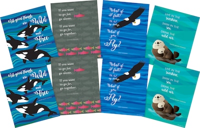 Barker Creek's What if You Fly Art Prints Set include eight 8 x 10" art prints (two each of four prints). These art prints are perfect for the classroom, workplace or home! Frame them or hang them "as is"! The designs feature playful otters, beautiful bald eagles, magnificent orca whales, and colorful sockeye salmon. The bald eagle art print features the quote "What if I fall? Oh, but my darling, What if you Fly?" Erin Hanson. The quote on the otter art print says "Live in the sunshine, Swim in the sea, Drink the wild air." Ralph Waldo Emerson. The salmon art print features the quote "If you want to go fast, go alone. If you want to go far, go together." African Proverb. The quote on the orca whale art print says "All good Things are Wild and Free" Henry David Thoreau. Coordinating products available: Search Barker Creek Sea & Sky.