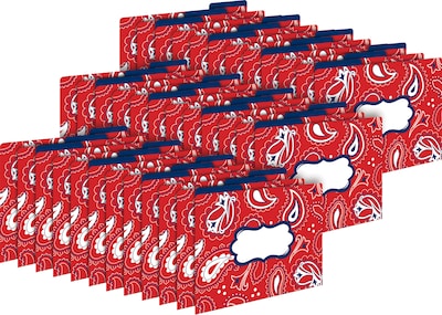 Barker Creek's Bandana letter-sized file folders are a fun and hip way to stay organized. This set includes 36 colorful folders and the inside of the folders are a beautiful solid red color making each folder fully reversible for added value! The tabs are 1/3 cut and the folders are printed on durable 12-point stock. They are great for everyday filing needs, presenting meeting handouts, organizing important papers, sending work home with students, storing treasured photos and archiving other significant mementos. The possibilities are limited only by your imagination! Coordinating products available: Search Barker Creek Western.