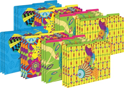 Barker Creek's Bohemian Animals Letter-Sized File Folders are a great way to organize your office, classroom, and home with style and flair! This set of stylish desk accessories includes 24 file folders - six each of four colorful designs. There is an owl, a fox, an elephant and giraffes! The folders are 1/3 tabbed, which means that they have three tab positions - eight folders are tabbed on the left, eight folders are tabbed in the center, and eight are tabbed on the right. The 14-point stock makes these folders perfect for desktop filing, meeting handouts, and student papers. These unique office supplies are fully reversible, each folder having a multicolored design on one side and a vibrant, solid color on the reverse side. The possibilities are limited only by your imagination! Coordinating products are available. Search: Barker Creek Bohemian Animals.