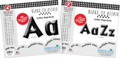 Barker Creek's Black Tie Affair 2" & 4" Letters & Numbers Pop-Outs Set are sure to brighten up your next project with these timeless bulletin board numbers and letters. This two-pack set includes a well-researched assortment of 931 letters, numbers, and punctuation marks (including Spanish) that have white accents to create a 3-D effect -- 255 in the 4” Black Tie Affair design and another 676 in the 2” Black Tie Affair design. Each design includes uppercase and lowercase letters, numbers and punctuation marks. You'll find multiple uses for these die-cut letters. Super chic & easy to read, they’re perfect for your next project, presentation, report, poster or display. Use them to letter posters, create professional signs, make beautiful bulletin board displays, label presentation materials, make your Employee of the Month boards true eye-catchers, personalize your workspace and more! Coordinating products are available. Search: Barker Creek Black & White.