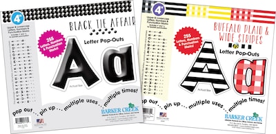 Barker Creek's Stripes & Solids 4" Letter and Number Pop-Out Set are sure to brighten up your next project with these versatile bulletin board numbers and letters. This two-pack set includes a well-researched assortment of 510 letters, numbers, and punctuation marks (including Spanish) -- 255 in the Black Tie Affair design and another 255 in the Buffalo Plaid & Wide Stripes design. Each design includes uppercase and lowercase letters, numbers and punctuation marks. You'll find multiple uses for these die-cut letters. Super chic & easy to read, they’re perfect for your next project, presentation, report, poster or display. Use them to letter posters, create professional signs, make beautiful bulletin board displays, label presentation materials, make your Employee of the Month boards true eye-catchers, personalize your workspace and more! Uppercase Letters and numbers are 4" tall, making the board letters easy to see from a few yards away. Short lowercase letters (like a and z) are 2" tall. Coordinating products available: Search Barker Creek Black & White and Barker Creek Buffalo Plaid & Wide Stripes.