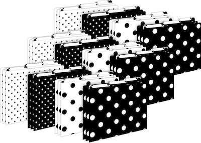 Barker Creek's Black & White Dot Letter-Size File Folders are an affordable way to organize your office, classroom, or home with style and flair. This set of stylish desk accessories includes 36 file folders - nine each of four designs. The folders are 1/3 tabbed, which means that they have three tab positions - twelve folders are tabbed on the left, twelve folders are tabbed in the center, and twelve are tabbed on the right. The 14-point stock makes these folders perfect for desktop filing, meeting handouts, and student papers. These unique office supplies are fully reversible, each folder having a black & white dot design on one side and a different dot design on the reverse side. The possibilities are limited only by your imagination! Coordinating products are available. Search: Barker Creek Black & White and Barker Creek Dots.