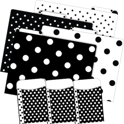 Barker Creek's Black & White Dot Folder/Pocket Set is great for so many projects! The set includes 12 folders -- three each of four beautiful designs and 30 peel & stick library pockets. The file folders are printed on 14-point stock which makes them perfect for desktop filing, meeting handouts, and student papers. Create learning center activities and lapbooks, or simply add pockets to your folders for filing smaller items or keeping an index card size list. It's easy to customize Barker Creek's Folder/Pocket set to fit your needs and works well in any school, home, office, or dorm. Coordinating products available: Search Barker Creek Bohemian Animals.