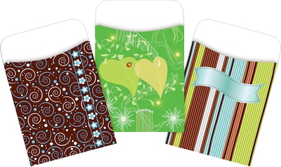 Barker Creek's Calm Colors Library Pocket Set is versatile and fun! Library Pockets are great for organizing flash cards, hall passes, file folder game pieces, spelling word lists, library cards, reading logs, and more! Set includes 90 pockets of assorted designs. There are thirty each of three designs. Each pocket is 3 1/2" x 5 1/8" and will hold standard 3" x 5" index cards. Please note you will need to use your own double-sided tape or glue if you want to adhere these pockets to another surface. We are not advertising these library pockets as "peel and stick" as the adhesive strips on the backs are no longer sticky.