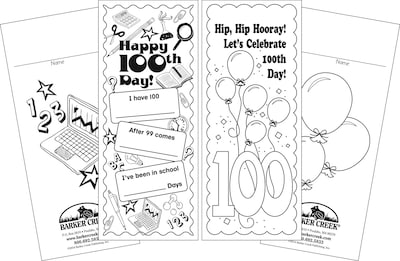 Barker Creek Celebrate 100th Day Bookmark Set features two bookmarks — Hip, Hip Hooray! Let’s Celebrate 100th Day! and Happy 100th Day! Celebrate seasons, holidays, and special events with their darling new Bookmark Duets! Each set includes 60 bookmarks – 30 each of two designs. Printed on durable card stock, they are printed on both sides and are designed to be decorated. So break out the colored pencils, crayons, glitter and glue! Your children will love creating their own mini-masterpieces! Punch a hole in the top and attach a tassel or a yarn loop. The possibilities are limited only by your imagination! Coordinating products available: Search Barker Creek Celebrate.