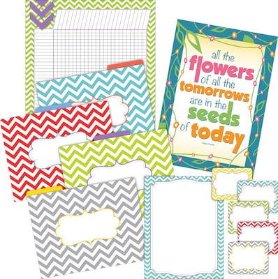 Barker Creek's Chevron Beautiful Office/Classroom Set will help you stay on task in style! Barker Creek bundled 5 of their bestselling products to bring you this Office/Classroom Set. Included in this popular set are 12 letter-sized fashion file folders, 45 self-adhesive labels/name badges, 50 sheets of coordinating computer paper, incentive chart, and an inspirational poster. The file folders are printed on sturdy 12 point cardstock, feature 1/3 cut tabs, and are reversible. The self-adhesive labels measure 3.5" x 2.75" and come with 3 each of 15 designs. The coordinating paper is compatible with most laser and inkjet printers and measures 8.5" x 11". This stylish incentive chart measures 17" x 22" and has 1/2" squares; space for 40 student names and 24 assignments. The inspirational poster measures 19" high x 13 3/8" wide, is printed on durable 12 pt. stock, and features an Indian Proverb ~ "All the flowers of all the tomorrows are in the seeds of today." Say goodbye to boring old office supplies and hello to fun and fashion! Coordinating products available: Search Barker Creek Chevron.