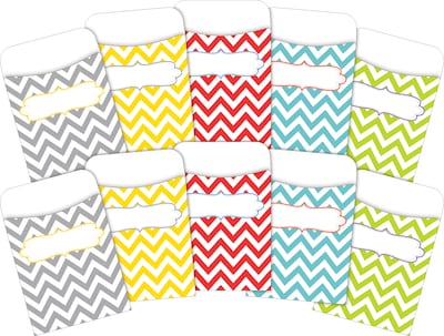Barker Creek's Chevron Beautiful Peel & Stick Library Pockets are versatile little work horses. Library Pockets are great for organizing flash cards, hall passes, file folder game pieces, spelling word lists, library cards, reading logs, and more! How you choose to use them is limited only by your imagination! The package includes 60 peel & stick pockets - twelve each of five colorful designs. Each pocket measures 3 1/2" x 5 1/8" and is sized to hold standard 3" x 5" index cards. These library pockets have two peel & stick strips on the back so you can easily adhere them to the inside of your books. But don't stop there! They will also stick to charts, file folders, storage cubbies, and more. Pockets in the set have a pre-printed label on the front so you can personalize them with staff or student names, presentation dates, list their contents or note other helpful information. Coordinating products are available. Search Barker Creek Chevron.