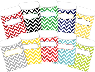 Barker Creek's Chevron Library Pockets Set is versatile and fun! Library Pockets are great for organizing flash cards, hall passes, file folder game pieces, spelling word lists, library cards, reading logs, and more! This set has 2 packages and each package includes 30 pockets for a total of 60 peel & stick pockets! This is a multi-design set - 6 each of 10 on-trend designs. Each pocket is 3 1/2" x 5 1/8". Each pocket has two self-adhesive peel & stick strips on the back making them easy to adhere to file folders, binders, charts, signs, hallways, and doors. There is a pre-printed "label" on the front of most of the pockets in this set for recording student names, labeling contents, identifying hall passes, writing book titles - the possibilities are limited only by your imagination. Coordinating product available: Search Barker Creek Chevron.