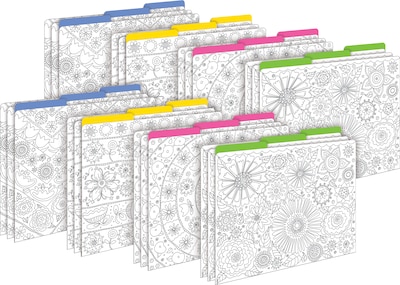 Barker Creek's Color Me! In My Garden Letter-Sized File Folders are an affordable way to organize your office, classroom, and home with style and flair. They also serve as 24 amazing coloring pages so grab your favorite pack of crayons or color pencils and get coloring! Then use your masterpiece to help you organize! This set of stylish desk accessories includes 24 file folders - six each of four designs. The folders are 1/3 tabbed, which means that they have three tab positions - eight folders are tabbed on the left, eight folders are tabbed in the center, and eight are tabbed on the right. The 14-point stock makes these folders perfect for desktop filing, meeting handouts, and student papers. Fully reversible, each folder has a design on one side to be colored in and a vibrant, solid color on the reverse side – perfect for making file folder games and lap books. The possibilities are limited only by your imagination! Coordinating products are available. Search: Barker Creek Color Me!