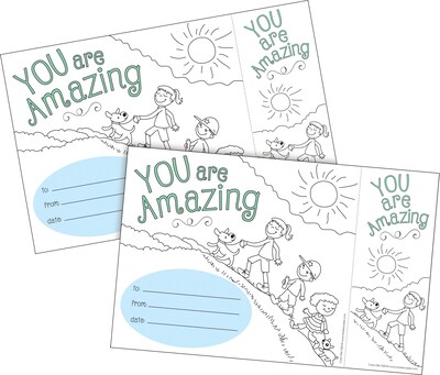 Barker Creek’s Color Me! You Are Amazing Awards & Bookmarks Set are unique and interactive awards that are easy to personalize, and include a detachable bookmark on the side. Each set includes 60 awards and coordinating bookmarks! One side has a glossy finish and a splash of color already printed on it. The flip side has a crayon-friendly matte finish and black and white line art. Designed to be colored by the recipient, these awards and bookmarks are a wonderful and affordable way to celebrate your students’ and engage them in the process! Each Award and Bookmark sheet measures 8.5" x 5.5". Awards measure 6.75" x 5.5" and Bookmarks measure 1.75" x 5.5". Coordinating products available: Search Barker Creek Color Me!