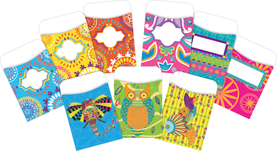 Barker Creek's Colorful Library Pocket Set is versatile and fun! Library Pockets are great for organizing flash cards, hall passes, file folder game pieces, spelling word lists, library cards, reading logs, and more! Set includes 90 pockets of assorted designs. There are ten each of nine designs. Each pocket is 3 1/2" x 5 1/8" and will hold standard 3" x 5" index cards. Please note you will need to use your own double-sided tape or glue if you want to adhere these pockets to another surface. We are not advertising these library pockets as "peel and stick" as the adhesive strips on the backs are no longer sticky.