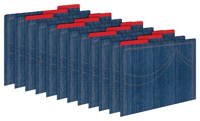 The set includes 12 folders and sport a hip denim background, jazzy "stitching" and a red-hot, solid-color interior (which makes them perfect for making lap books and file folder games)! The tabs are 1/3 cut and the folders are printed on durable 12-point stock. In addition to being great for everyday filing needs, these folders are also perfect for presenting meeting handouts, organizing important papers, sending work home with students, storing treasured photos and archiving other significant mementos. The possibilities are limited only by your imagination!