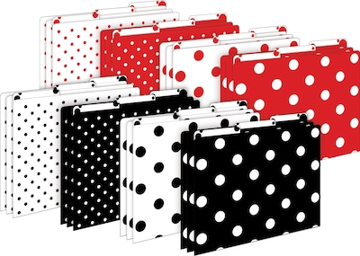 Barker Creek's Dots Letter-Size File Folders are an affordable way to organize your office, classroom, or home with style and flair. This set of stylish desk accessories includes two of our best selling designs - Black & White Dots and Red & White Dots. There are 24 file folders - three each of eight designs. The folders are 1/3 tabbed, which means that they have three tab positions - eight folders are tabbed on the left, eight folders are tabbed in the center, and eight are tabbed on the right. The 14-point stock makes these folders perfect for desktop filing, meeting handouts, and student papers. These unique office supplies are fully reversible, twelve of the folder having a black & white dot design on one side and a different dot design on the reverse side while the other twelve folders feature the same designs but in red & white dots. The possibilities are limited only by your imagination! Coordinating products are available. Search: Barker Creek Dots.