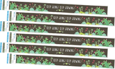 Barker Creek's Prickles Double-Sided Trim set includes four packages of their top selling trim Prickles and is as stylish as can be! This trim features coordinating designs on both sides! One side features beautiful cacti, succulents, and bright flowers on a brown background! The flip side has more succulents, cacti, and lovely flowers and features the saying - Keep Going! Keep Growing! Includes 72 strips of trim measuring 3" high by 35" long " that's 210 feet of 'WOW' per package! They are perfect for adding a stylish and fun touch to your classroom! These durable, bright borders are printed on thick, coated paper. Use these beautiful double-sided borders from Barker Creek as bulletin board borders, frame doorways, define learning centers, and decorate your classroom windows. Jazz up your office, decorate breakrooms and create welcoming reception areas. Coordinating products available: Search Barker Creek Petals & Prickles.