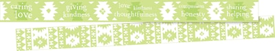 Barker Creek's Thoughtfulness Double-sided border has coordinating designs on both sides! One side features a calming light green color with the words caring, love, giving, kindness, thoughtfulness, compassion, honesty, sharing, and helping. The other side features the same light green background with on-trend designs. Each package includes 24 strips of trim measuring 35" long 3" wide -- that's 70 feet of 'WOW' per package! They are perfect for adding a stylish and fun touch to your classroom! These durable, calming borders are printed on thick, coated paper. Use these beautiful double-sided borders from Barker Creek as bulletin board borders, frame doorways, define learning centers, and decorate your classroom windows. Jazz up your office, decorate breakrooms and create welcoming reception areas. Coordinating products available: Search Barker Creek Thoughtfulness.