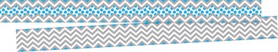 Barker Creek's Chevron double-sided border set features six packages of trim and each of them have coordinating designs on both sides! This set includes 6 packages of Chevron trim – navy, red, turquoise, gray, black and gray chevron with light blue. This set includes 72 strips of trim measuring 3" high by 35" long " that's 210' of 'WOW' per set! They are perfect for adding a stylish and fun touch to your classroom! One side of the Navy Chevron trim features navy chevron with hints of yellow and the opposite side has fun yellow polka dots and navy chevron. The Red Chevron trim has red chevron with hints of navy and the opposite side has fun navy polka dots and red chevron. One side of the Turquoise Chevron trim features turquoise chevron with hints of orange and the opposite side has fun orange polka dots and turquoise chevron. The Gray Chevron trim has gray chevron with hints of yellow and the opposite side has fun yellow polka dots and gray chevron. Side one of the Black Chevron trim features an on-trend black chevron patter and side two features a coordinating chevron pattern accented in the center with white dots. The Gray/Light Blue Chevron trim has gray chevron with hints of light blue and the opposite side has fun light blue polka dots and gray chevron. These durable, bright borders are printed on thick, coated paper. Use these beautiful double-sided borders from Barker Creek as bulletin board borders, frame doorways, define learning centers, and decorate your classroom windows. Jazz up your office, decorate breakrooms and create welcoming reception areas. Coordinating products available: Search Barker Creek Chevron.