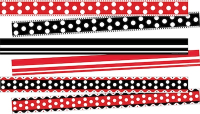 Barker Creek's Stripes & Dots Double-Sided Trim set includes three packages of their top selling trim and is as stylish as can be! Each package includes twelve 35" long x 3" wide strips of trim for a total of 105 FEET of trim per set! The Wide Stripes Border are a classy way to create a framing effect for any bulletin board or presentation! The black & white and/or red & white designs are perfectly versatile with any pattern or color scheme! They are perfect for adding a stylish and fun touch to your classroom! These durable, bright borders are printed on thick, coated paper. Use these beautiful double-sided borders from Barker Creek as bulletin board borders, frame doorways, define learning centers, and decorate your classroom windows. Jazz up your office, decorate breakrooms and create welcoming reception areas. Coordinating product available: Search Barker Creek Dots and Barker Creek Buffalo Plaid & Wide Stripes.