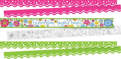 Barker Creek's Garden Oasis Double-Sided Trim set includes three packages of their top selling trim and is as stylish as can be! Two of the packages each include thirteen 36" long x 2.25" wide strips of trim that feature a sporty scalloped edge for a total of 78 feet of trim per set! These packages of trim feature an on-trend design with dots and swirls with coordinating designs on both sides and the colors are Happy Hot Pink and Happy Lime. The other package includes twelve 35" long x 3" wide strips of trim which measures 35 feet. This package of trim features beautiful colors with lovely flowers and it says 'Inspiration begins here!'. There is a total of 113 feet of trim in this set! Mix and match to your hearts content! They are perfect for adding a stylish and fun touch to your classroom! These durable, bright borders are printed on thick, coated paper. Use these beautiful double-sided borders from Barker Creek as bulletin board borders, frame doorways, define learning centers, and decorate your classroom windows. Jazz up your office, decorate breakrooms and create welcoming reception areas. Coordinating product available: Search Barker Creek Happy, Barker Creek Dot to Dot and Barker Creek Color Me!