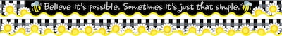 Barker Creek's Double-Sided Believe It’s Possible Border features a sporty scalloped edge. Raising the bar on the competition, Barker Creek’s trim is also double-sided with coordinating designs printed on both sides! That gives you twice as many decorating opportunities in a single package. Each package includes thirteen 36” long x 2 1/4” wide strips of trim for a total of 39 FEET of trim per package! Side one features a beautiful black and white buffalo plaid design with vibrant yellow daisies. Side two features a coordinating pattern along with the saying, “Believe it’s possible. Sometimes it’s just that simple.” They are perfect for adding a stylish and fun touch to your classroom! These durable, bright borders are printed on thick, coated paper. Use these beautiful double-sided borders from Barker Creek as bulletin board borders, frame doorways, define learning centers, and decorate your classroom windows. Jazz up your office, decorate breakrooms and create welcoming reception areas. Coordinating product available: Search Barker Creek Buffalo Plaid & Wide Stripes.