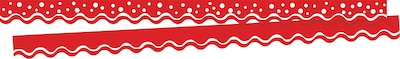 Barker Creek's Double-Sided Happy Cherry Border features a sporty scalloped edge. Raising the bar on the competition, Barker Creek’s trim is also double-sided with coordinating designs printed on both sides! That gives you twice as many decorating opportunities in a single package. Each package includes thirteen 36” long x 2 1/4” wide strips of trim for a total of 39 FEET of trim per package! Side one features a fun red & white dot pattern with a wavy white rule along the scalloped edge. Side two features a coordinating pattern with just the wavy rule. Mix and match to your hearts content! They are perfect for adding a stylish and fun touch to your classroom! These durable, bright borders are printed on thick, coated paper. Use these beautiful double-sided borders from Barker Creek as bulletin board borders, frame doorways, define learning centers, and decorate your classroom windows. Jazz up your office, decorate breakrooms and create welcoming reception areas. Coordinating product available: Search Barker Creek Happy and Barker Creek Dot to Dot.