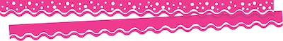Barker Creek's Double-Sided Happy Hot Pink Border features a sporty scalloped edge. Raising the bar on the competition, Barker Creek’s trim is also double-sided with coordinating designs printed on both sides! That gives you twice as many decorating opportunities in a single package. Each package includes thirteen 36” long x 2 1/4” wide strips of trim for a total of 39 FEET of trim per package! Side one features a fun hot pink & white dot pattern with a wavy white rule along the scalloped edge. Side two features a coordinating pattern with just the wavy rule. Mix and match to your hearts content! They are perfect for adding a stylish and fun touch to your classroom! These durable, bright borders are printed on thick, coated paper. Use these beautiful double-sided borders from Barker Creek as bulletin board borders, frame doorways, define learning centers, and decorate your classroom windows. Jazz up your office, decorate breakrooms and create welcoming reception areas. Coordinating product available: Search Barker Creek Happy and Barker Creek Dot to Dot.