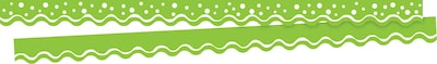 Barker Creek's Happy Lime Double-Sided Trim 2-pack features a sporty scalloped edge! This set includes 2 packages of Happy Lime Scalloped trim. Each package of trim includes 13 strips of trim measuring 2 1/4" high by 36" long — that’s 78 feet of WOW per package! Raising the bar on the competition, Barker Creek’s trim is also double-sided with coordinating designs printed on both sides! That gives you twice as many decorating opportunities in a single package. Side one features a fun lime green & white dot pattern with a wavy white rule along the scalloped edge. Side two features a coordinating pattern with just the wavy rule. Mix and match to your hearts content! They are perfect for adding a stylish and fun touch to your classroom! These durable, bright borders are printed on thick, coated paper. Use these beautiful double-sided borders from Barker Creek as bulletin board borders, frame doorways, define learning centers, and decorate your classroom windows. Jazz up your office, decorate breakrooms and create welcoming reception areas. Coordinating product available: Search Barker Creek Happy and Barker Creek Dot to Dot.