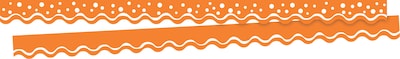 Barker Creek's Double-Sided Happy Tangerine Border features a sporty scalloped edge. Raising the bar on the competition, Barker Creek’s trim is also double-sided with coordinating designs printed on both sides! That gives you twice as many decorating opportunities in a single package. Each package includes thirteen 36” long x 2 1/4” wide strips of trim for a total of 39 FEET of trim per package! Side one features a fun tangerine & white dot pattern with a wavy white rule along the scalloped edge. Side two features a coordinating pattern with just the wavy rule. Mix and match to your hearts content! They are perfect for adding a stylish and fun touch to your classroom! These durable, bright borders are printed on thick, coated paper. Use these beautiful double-sided borders from Barker Creek as bulletin board borders, frame doorways, define learning centers, and decorate your classroom windows. Jazz up your office, decorate breakrooms and create welcoming reception areas. Coordinating product available: Search Barker Creek Happy and Barker Creek Dot to Dot.