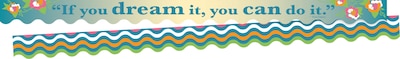 Barker Creek's You Can Do It Double-Sided Trim 2-pack features a sporty scalloped edge! This set includes 2 packages of You Can Do It Scalloped trim. Each package of trim includes 13 strips of trim measuring 2 1/4" high by 36" long — that’s 78 feet of WOW per package! Raising the bar on the competition, Barker Creek’s trim is also double-sided with coordinating designs printed on both sides! That gives you twice as many decorating opportunities in a single package. Side one features this quote by Walt Disney, “If you dream it, you can do it.” Side two features a coordinating wave design in bright, on-trend colors. Mix and match to your hearts content! They are perfect for adding a stylish and fun touch to your classroom! These durable, bright borders are printed on thick, coated paper. Use these beautiful double-sided borders from Barker Creek as bulletin board borders, frame doorways, define learning centers, and decorate your classroom windows. Jazz up your office, decorate breakrooms and create welcoming reception areas. Coordinating product available: Search Barker Creek Happy.