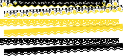 Barker Creek's Believe it's Possible Double-Sided Scalloped Trim set includes three packages of their top selling trim and is as stylish as can be! Each package includes thirteen 36" long x 2.25" wide strips of trim that feature a sporty scalloped edge for a total of 117 FEET of trim per set! Two of the packages of trim in this set feature a very on-trend design with dots and swirls with coordinating designs on both sides. The colors of these two packages of trim are Happy Lemon Yellow and Happy Black. The third package of trim features a beautiful black and white buffalo plaid design with vibrant yellow daisy's. The flip side features a coordinating pattern along with the saying, "Believe it's possible. Sometimes it's just that simple." Mix and match to your hearts content! They are perfect for adding a stylish and fun touch to your classroom! These durable, bright borders are printed on thick, coated paper. Use these beautiful double-sided borders from Barker Creek as bulletin board borders, frame doorways, define learning centers, and decorate your classroom windows. Jazz up your office, decorate breakrooms and create welcoming reception areas. Coordinating product available: Search Barker Creek Happy, Barker Creek Dot to Dot and Barker Creek Buffalo Plaid & Wide Stripes.