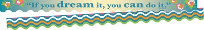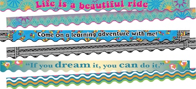 Barker Creek's Life Quotes Double-Sided Scalloped Trim set includes three packages of their top selling trim and is as stylish as can be! Each package includes thirteen 36" long x 2.25" wide strips of trim that feature a sporty scalloped edge for a total of 117 FEET of trim per set! The first package of trim features a beautiful design with vibrant colored leaves and the saying, "Come on a Learning Adventure with Me!" on the front and the flip side features a black and white boho aztec coordinating pattern. The second package of trim of trim features a lovely turquoise color with vibrant colored designs and the saying, "Life is a beautiful ride" on the front and the flip side features a colorful coordinating pattern. The third package of trim features a lovely blue color with vibrant colored flowers and the quote "If you dream it, you can do it" by Walt Disney on the front. The flip side features a colorful coordinating pattern. Mix and match to your hearts content! They are perfect for adding a stylish and fun touch to your classroom! These durable, bright borders are printed on thick, coated paper. Use these beautiful double-sided borders from Barker Creek as bulletin board borders, frame doorways, define learning centers, and decorate your classroom windows. Jazz up your office, decorate breakrooms and create welcoming reception areas. Coordinating product available: Search Barker Creek Bohemian, Barker Creek Happy, Barker Creek Dot to Dot and Barker Creek Bohemian Animals