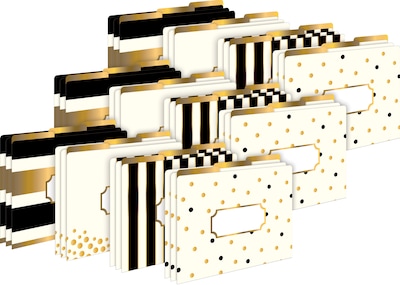 Barker Creek's Gold Letter-Size File Folders are an affordable way to organize your office, classroom, or home with style and flair. This set of gold desk accessories includes 36 file folders - nine each of four colorful designs. The folders are 1/3 tabbed, which means that they have three tab positions - twelve folders are tabbed on the left, twelve folders are tabbed in the center, and twelve are tabbed on the right. The gold file folders come with a preprinted "label" on the front for adding a table of contents, highlighting meeting agendas, listing the names of team members, bulleting travel itineraries, and so much more. These unique office supplies are fully reversible, each folder having a colorful gold, black and cream design on one side and a clean and calm gold and cream design on the reverse side. The 14-point stock makes these folders perfect for desktop filing, meeting handouts, and student papers. The possibilities are limited only by your imagination! Coordinating products are available. Search: Barker Creek Gold.