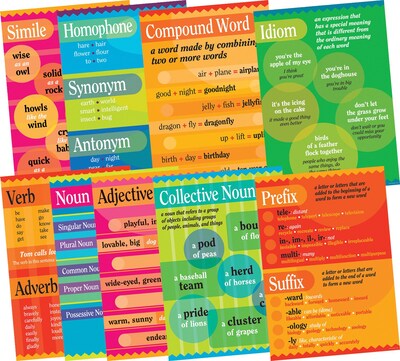Poster sets includes all nine of grammar posters. Includes verb/adverb, noun, collective noun, simile, idiom, compound word, adjective, homophone/synonym/antonym, and prefix/suffix.