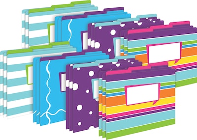 Barker Creek's Happy Letter-Size File Folders are an affordable way to organize your office, classroom, or home with style and flair. This set of stylish desk accessories includes 24 file folders - six each of four colorful designs. The folders are 1/3 tabbed, which means that they have three tab positions - eight folders are tabbed on the left, eight folders are tabbed in the center, and eight are tabbed on the right. The 14-point stock makes these folders perfect for desktop filing, meeting handouts, and student papers. These Happy file folders come with a preprinted "label" on the front for adding a table of contents, highlighting meeting agendas, listing the names of team members, bulleting travel itineraries, and so much more. These unique office supplies are fully reversible, each folder having a multicolored design on one side and a soft, solid color on the reverse side. The possibilities are limited only by your imagination! Coordinating products are available. Search: Barker Creek Happy.
