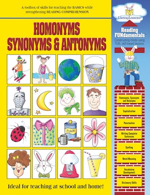 Barker Creek’s Homophones, Synonyms & Antonyms Grammar Activity Book can help you explain what a homonym is in one simple sentence. It does the same for synonyms and antonyms as well. This activity book can also give your students several memorable examples of each. Your children will be able to confidently read and write these three types of words once they complete the exercises in this Reading FUNdamentals activity book. This is one of nine titles in the top-selling Reading FUNdamentals book series. 48 reproducible activity pages. Coordinating poster available. Search: Barker Creek Grammar Posters.