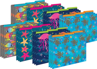 Barker Creek's Kai Ola Letter-Sized File Folders are an affordable way to organize your office, classroom, and home with style and flair. This set includes 24 file folders - six each of four beautiful designs. The first set of six folders features sea turtles with shells and starfish on a beautiful aqua blue background on the outside of the folder with a tangerine orange interior. The second set of six folders has vibrant colored jellyfish on a lovely navy and blue background on the outside with a lime green interior. The third set of six folders has colorful starfish of various sizes on a lovely blue and aqua background on the outside with a hot pink interior. The fourth set of six folders has beautiful fish of various colors and sizes on a lovely taupe background on the outside with an aqua blue interior. The folders are 1/3 tabbed, which means that they have three tab positions - eight folders are tabbed on the left, eight folders are tabbed in the center, and eight are tabbed on the right. Fully reversible, each folder has a colorful design on one side and a vibrant, solid color on the reverse side – perfect for making file folder games and lapbooks. The 14-point stock makes these folders perfect for desktop filing, meeting handouts, and student papers. The possibilities are limited only by your imagination! Coordinating products available: Search Barker Creek Kai Ola.