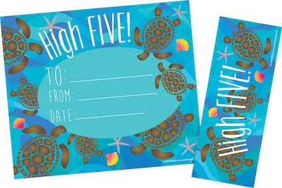 Barker Creek's Kai Ola High Five! Awards and Bookmarks designs feature a vibrant color palette with beautiful sea turtles, starfish, and shells on a lovely background of different shades of blue colors. Each Award/Bookmark sheet measures 8.5 inches x 5.5 inches. Awards measure 6.75 inches by 5.5 inches and Bookmarks measure 1.75 inches by 5.5 inches. Each package includes 30 High Five! awards and coordinating bookmarks attached. There is a space to write who the award is to, from, and the date. These award/bookmarks are designed to be detached by the recipient for a constant reminder of their success! Coordinating products available: Search Barker Creek Kai Ola.