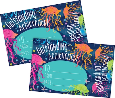 Barker Creek's Kai Ola Outstanding Achievement Awards and Bookmarks designs feature a vibrant color palette with beautiful jellyfish on a lovely background of different shades of blue colors. Each Award/Bookmark sheet measures 8.5 inches x 5.5 inches. Awards measure 6.75 inches by 5.5 inches and Bookmarks measure 1.75 inches by 5.5 inches. Each set includes 60 Outstanding Achievement awards and coordinating bookmarks attached. There is a space to write who the award is to, from, and the date. These award/bookmarks are designed to be detached by the recipient for a constant reminder of their success! Coordinating products available: Search Barker Creek Kai Ola.