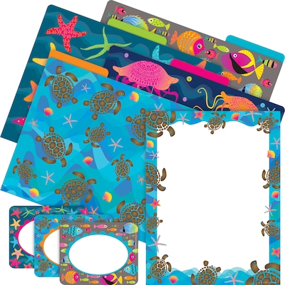 Barker Creek's Kai Ola Sea Turtles Get Organized Kit will help you stay on task in style! The file folders are printed on sturdy 14 point cardstock, feature 1/3 cut tabs, and are reversible. The self-adhesive labels measure 3.5" x 2.75" and come with 3 each of 15 designs. The coordinating paper is compatible with most laser and inkjet printers. Say goodbye to boring old office supplies and hello to fun and fashion! Coordinating products available: Search Barker Creek Kai Ola.