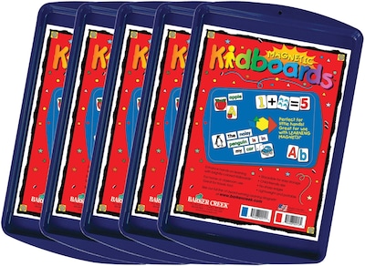 A set of boards with so much versatility for learning Barker Creek’s magnetic-receptive Kidboards are designed to fit on child-size desktops and laps. This set includes 5 blue Kidboards. They are a perfect companion to Barker Creek’s award-winning line of educational Learning Magnets (sold separately). Kidboards are great for use in classroom settings, at home, and even on trips! The boards have lips and can be easily stacked and neatly stored. They are lightweight and durable. Kidboards also make great portable desks. Use them outdoors when sketching or as lapboards when writing. The lip helps keep papers and manipulatives in place – an advantage over flat lapboards. Kidboards measures 9" x 13". They are also available individually. See Barker Creek’s full line of educational magnets and Kidboards by searching: Barker Creek Learning Magnets.
