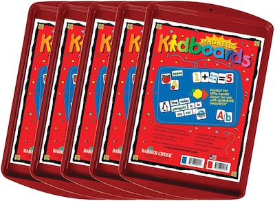 Barker Creek’s magnetic-receptive Kidboards are designed to fit on child-size desktops and laps. This set includes 5 red Kidboards. They are a perfect companion to Barker Creek’s award-winning line of educational Learning Magnets (sold separately). Kidboards are great for use in classroom settings, at home, and even on trips! The boards have lips and can be easily stacked and neatly stored. They are lightweight and durable. Kidboards also make great portable desks. Use them outdoors when sketching or as lapboards when writing. The lip helps keep papers and manipulatives in place – an advantage over flat lapboards. Kidboards measures 9" x 13". They are also available individually. See Barker Creek’s full line of educational magnets and Kidboards by searching: Barker Creek Learning Magnets.
