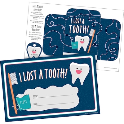 Barker Creek’s new Lost a Tooth Award set includes 15 colorful Lost A Tooth Recognition Certificates and 15 Templates to make necklace pendants and cute cut-and-tape envelopes to transport lost teeth home with your students. Printed on glossy 10pt stock, the awards and template sheets measure 8.5" wide by 5.5" high. Coordinating products available: Search Barker Creek Lost a Tooth.